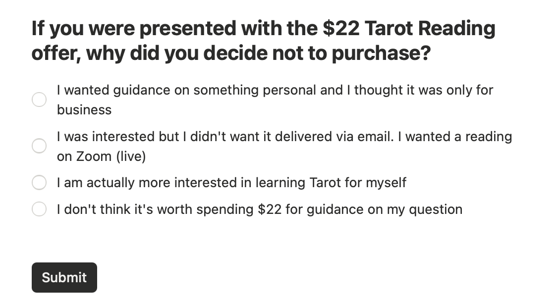 On a personal note — I thought my intro offer for the $22 1:1 reading would be a hit, but no one purchased it. See even a marketer can totally fail! LOLThat could be for a few reasons: maybe you wanted guidance on something personal instead of business, maybe you’d prefer a Zoom session over email, or maybe you’re curious to learn Tarot for yourself.This week, I’m leaning into curiosity: what’s next, what’s possible, and how can I pivot in a way that actually serves you?Your feedback will help me create brand-new offers that actually fit what you want — I can’t wait to see what you choose!
