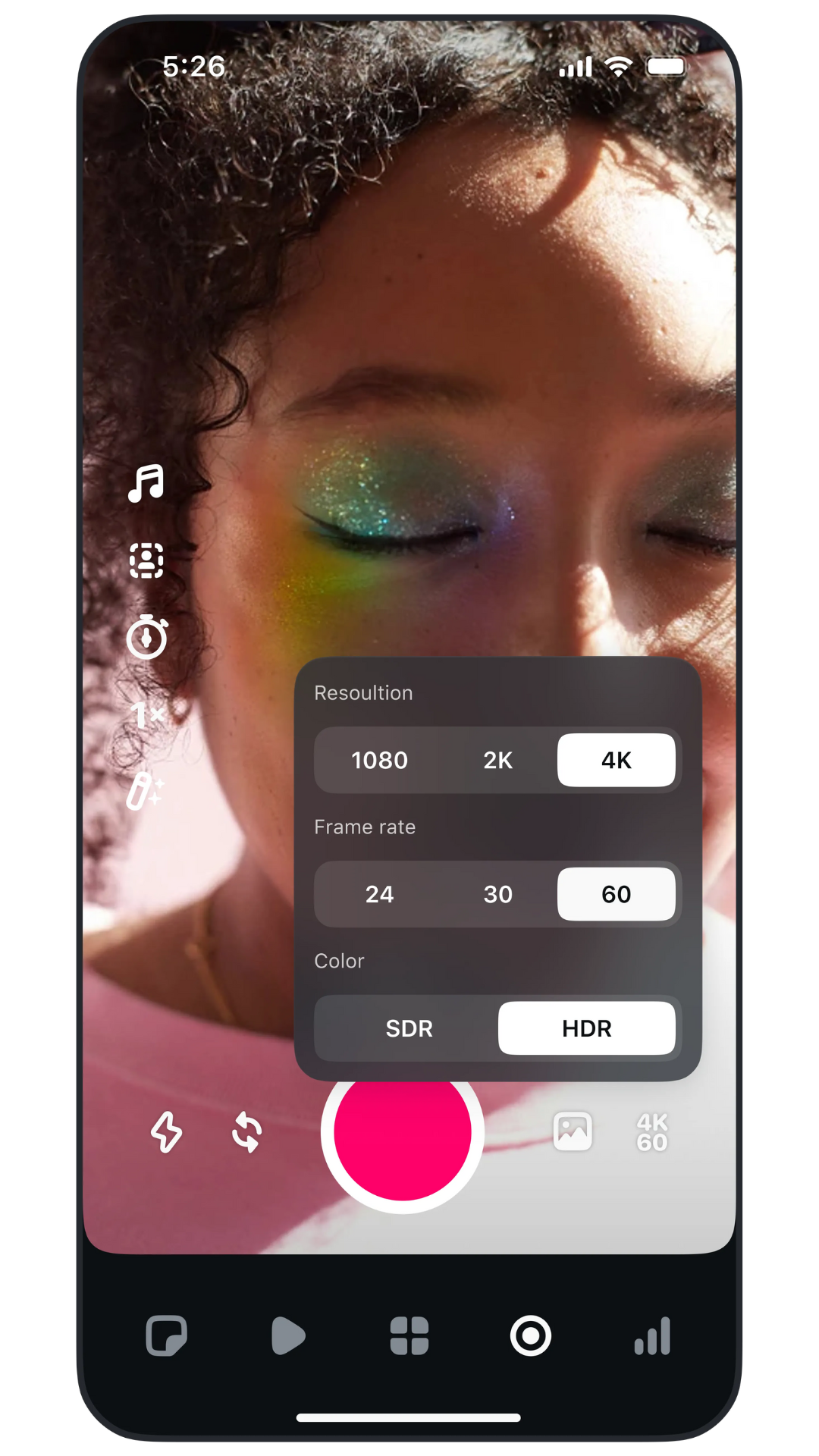 Camera: Capture (up to 10 minutes) and publish in enhanced video quality, with quick access to some of our most used reels creation features: touch up, green screen, the music catalogue, timer and countdown.