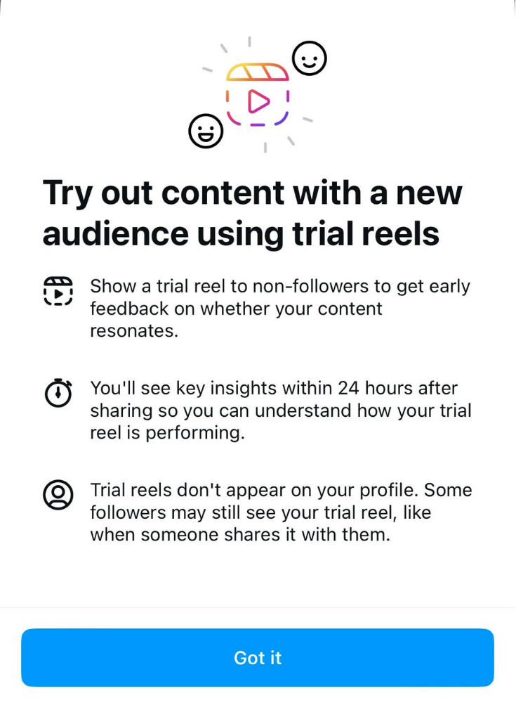 Trial reels on Instagram allows creators to experiment with new ideas and get early feedback on whether their content resonates by allowing them to share reels with accounts that don't follow them. You can later choose to share a trial reel with your followers at any time.